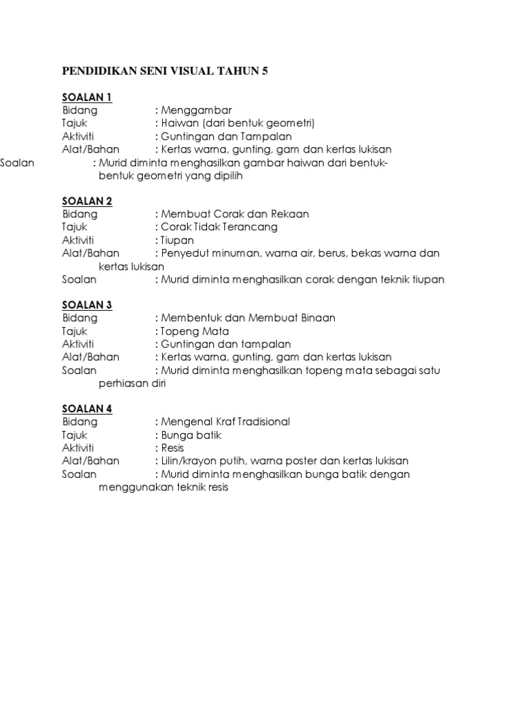 Blog ini mengandungi hasil kerja dan aktiviti pengajaran dan pembelajaran pendidikan seni tahun 5. Contoh rancangan pelajaran harian : Click to view in fullscreen. Soalan pendidikan seni tahun 4 by shika nara 7850 views. Pendidikan seni visual tingkatan 5.