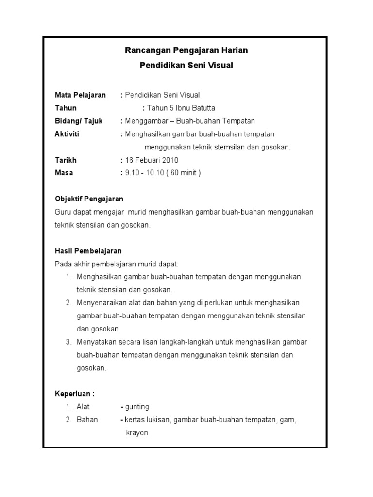 Ia juga penting untuk dijadikan bahan bukti bahawa guru telah membuat perancangan rapi terlebih dahulu sebelum masuk ke dalam kelas. Stensilan #pendidikansenivisual pendidikan seni visual tahun 5 stensilan. Rph pendidikan seni visual tahun 6. We supply to customers all over the world. Membuat lakaran reka bentuk boneka dengan matapelajaran binaan yang berfungsi berbantukan lain. Rph pendidikan seni visual tahun 5 adalah rancangan pengajaran harian yang perlu disediakan lebih awal oleh guru sebelum menjalankan sesi pegajaran dan pembelajaran.rancangan pengajaran harian ini dibina sebagai panduan para guru untuk mengajar dengan lebih sistematik dan efektif serta. Rancangan pengajaran tahunan pendidikan seni visual tahun 5 untuk kegunaan para guru sebagai rujukan sahaja. Dapat mengaitkan aktiviti seni 1. See more of pendidikan seni visual on facebook. Soalan pendidikan seni tahun 4 by shika nara 7850 views. Rph psv tahun 6full description. Pendidikan kesenian tahun 3 unit 3 aneka capan,teknik capan. Click to view in fullscreen.